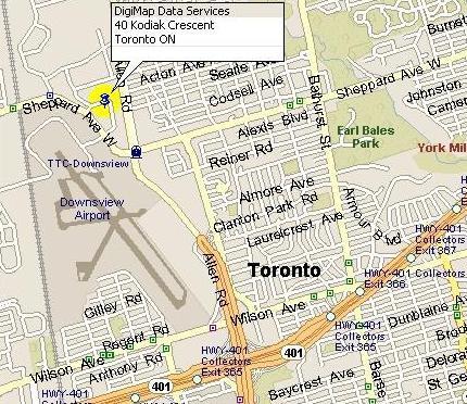To reach DigiMap's Sales/Service office, use Allen Road North exit from Hwy 401; proceed north to Sheppard Avenue; turn left onto Sheppard Avenue, then turn at the next right onto Kodiak Crescent.
